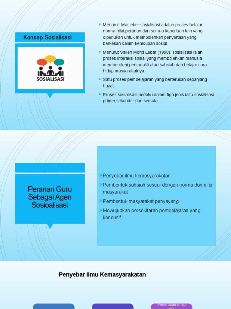 Selain itu guru juga berperanan sebagai agen sosialisasi dari aspek profession yang mana mereka sebagai penyebar budaya ilmu berperanan untuk mengembangkan penguasaan ilmu. Proses sosialisasi merupakan pendidikan sepanjang. 427-17-athirah menerbitkan Peranan Guru Sebagai Agen Sosialisasi pada 2021-03-20.